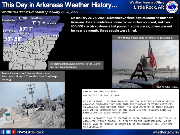 On the 12th anniversary of the 2009 ice storm that devastated northern Arkansas, the eastern portion of the Twin Lakes Area has been included in a winter weather advisory issued Tuesday by the National Weather Service’s North Little Rock office.