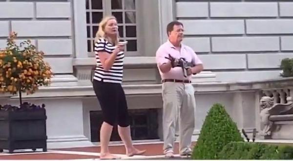 Photo: Armed homeowners standing in front their house along Portland Place confront protesters marching to St. Louis Mayor Lyda Krewson’s house on June 28, 2020 in the Central West End of St. Louis. (Laurie Skrivan/St. Louis Post-Dispatch via AP)