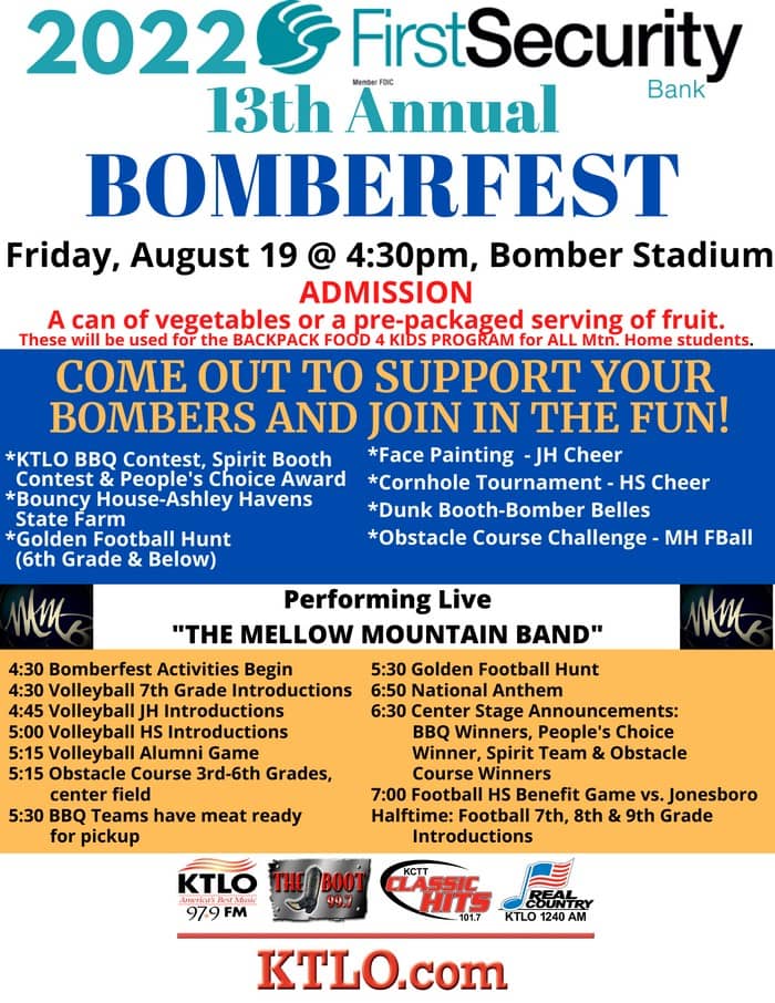 After a two-year absence due to the coronavirus pandemic, a special event returns to Mountain Home High School Career Academies to support two of the Bomber athetic programs. The annual First Security Bomberfest will be held Friday beginning at 4:30 at Bomber Stadium and Bomber Gymnasium.