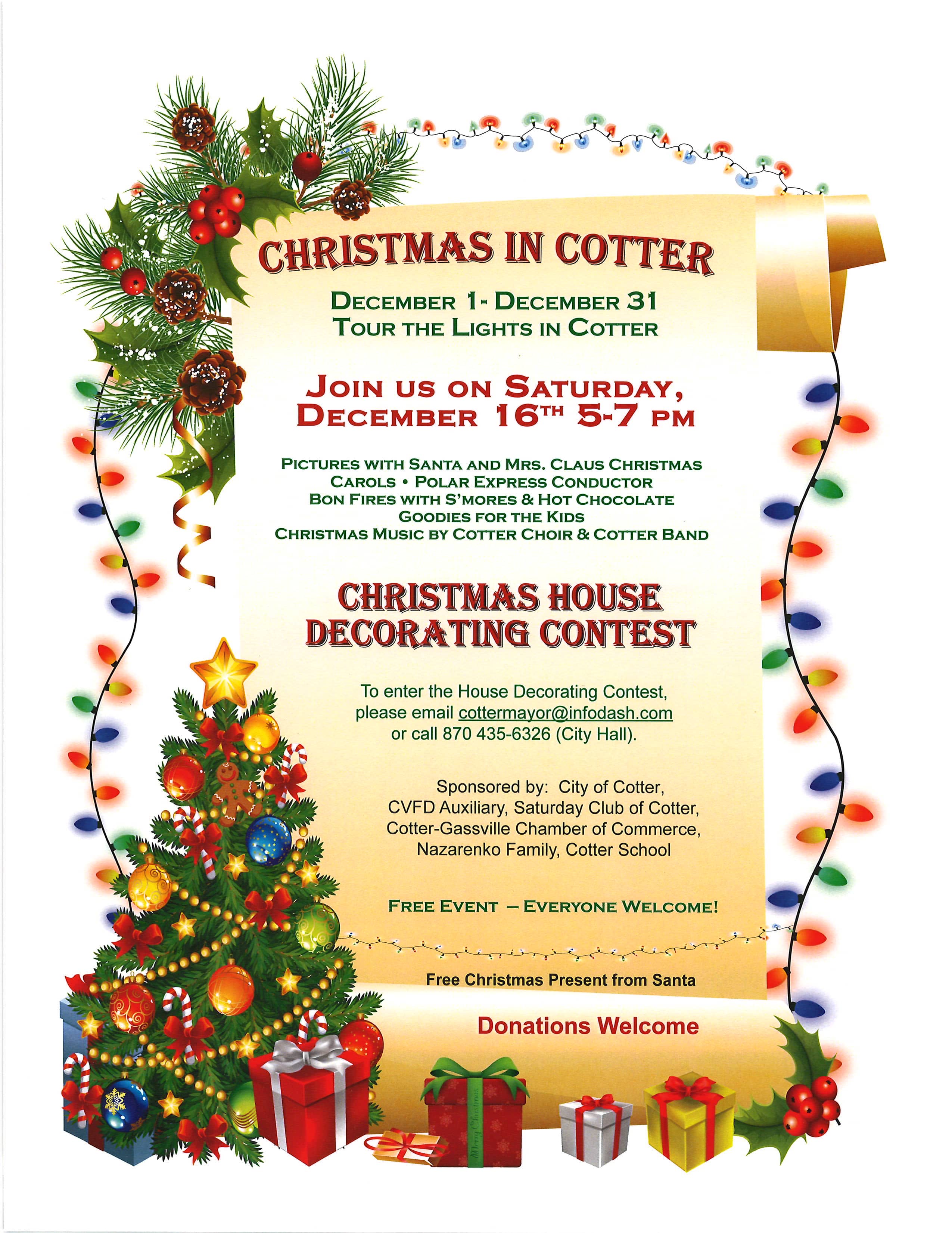 The 5th annual Christmas in Cotter festival will return Saturday night at Big Spring Park under the historic bridge in Cotter. The event will run from 5 until 7 and visitors can enjoy pictures with Santa and Mrs. Claus, bon fires with hot chocolate and s’mores, christmas music by the Cotter band and choir and much more.