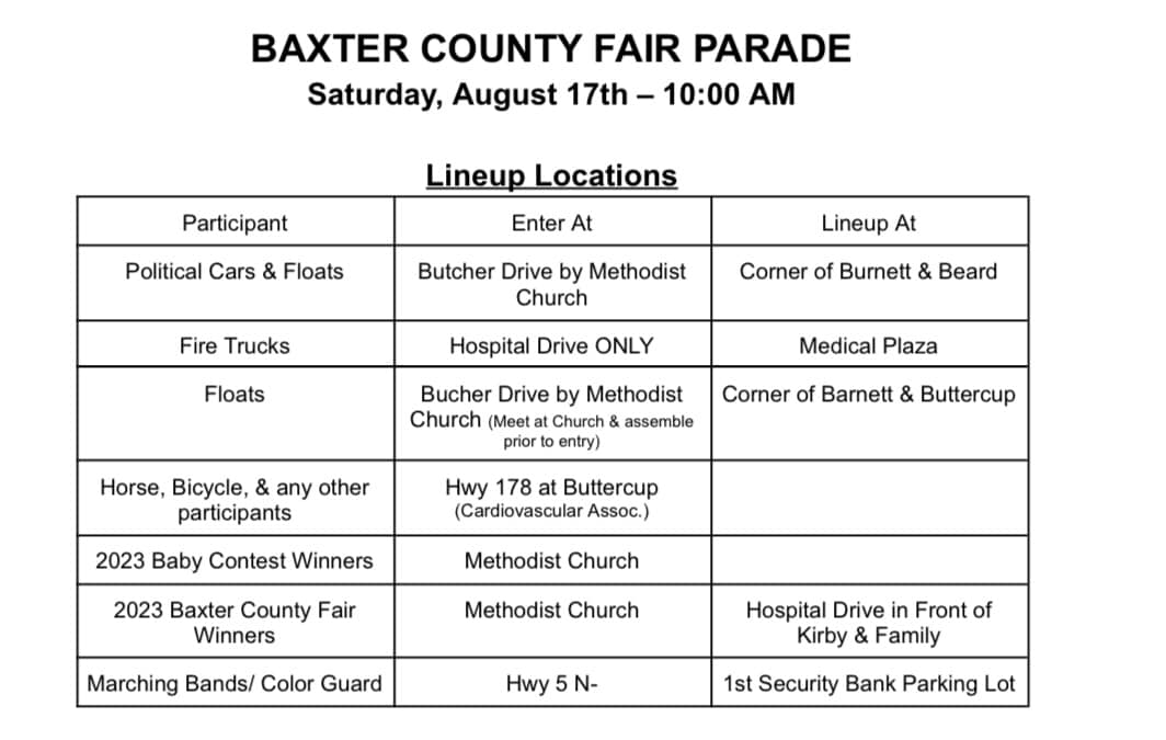 The Baxter County Fair Parade will be held this Saturday morning at 10. The parade will start at Long Chiropractic located at 506 Hospital Drive and will be led by the Baxter County Fair Queen, Mackenzi Clark. All entries must be in line for judging at 9:45 and there is no registration required to enter the parade.