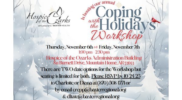 As the holiday season approaches, Hospice of the Ozarks is offering support to those experiencing grief with its annual “Coping with the Holidays” workshop Nov 6 and 7.