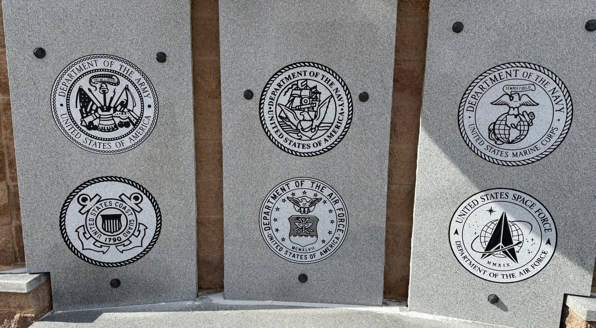 Visitors to the First Security Veterans Plaza 2000 in Mountain Home can now see new enhancements with the recent addition of the seals of the military branches to the center columns on the veterans wall.