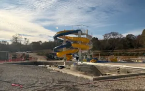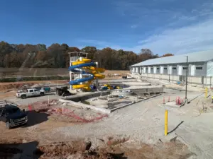 Outdoor pool, lazy river, and water slides under construction at the new community center