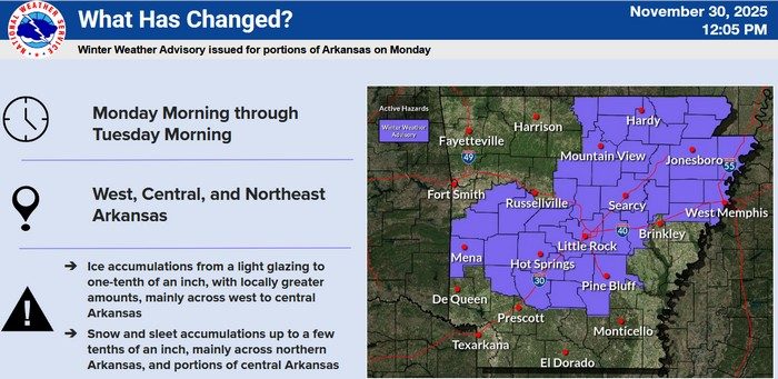 The National Weather Service in North Little Rock has issued a winter weather advisory for a portion of north central Arkansas starting Monday morning at 6:00 and running through Tuesday morning at 6:00. The advisory includes Baxter, Fulton, Izard and Stone counties. The advisory says light mixed precipitation is expected during that time frame which will cause hazardous driving conditions.