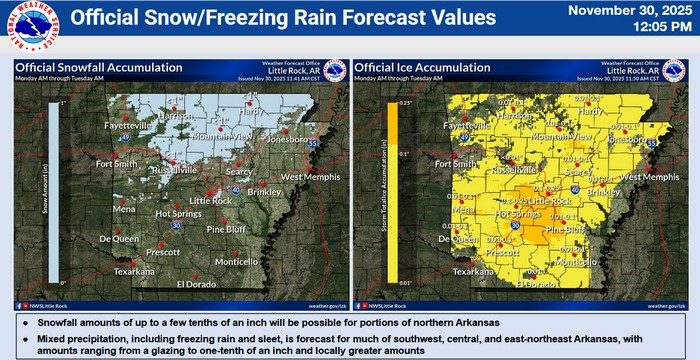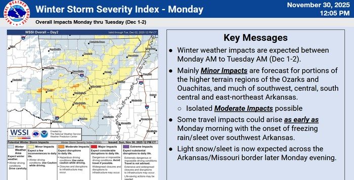 The impacts from freezing rain should be higher east and south of the Twin Lakes area from northeast to central Arkansas.