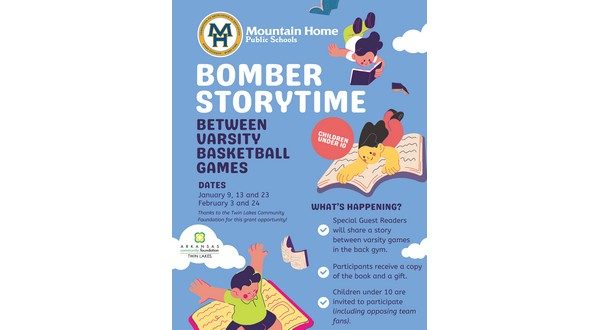 Mountain Home Public Schools and the Twin Lakes Community Foundation are partnering on a new early literacy initiative called Bomber Storytime, set to take place during select home basketball games in January and February. The event kicks off Friday and continues on Jan. 13, Jan. 23, Feb. 3 and Feb. 24. Bomber Storytime will be held between the varsity girls and boys games and is open to children ages 10 and under from both Mountain Home and visiting school. Each child will receive a free book and small giveaways.