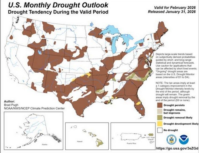 The U.S. Monthly Drought Outlook, which was issued Saturday and is valid for the month of February, is not promising. It shows the drought tendency for the month with all of northern Arkansas and southern Missouri in an area where the drought is expected to persist.