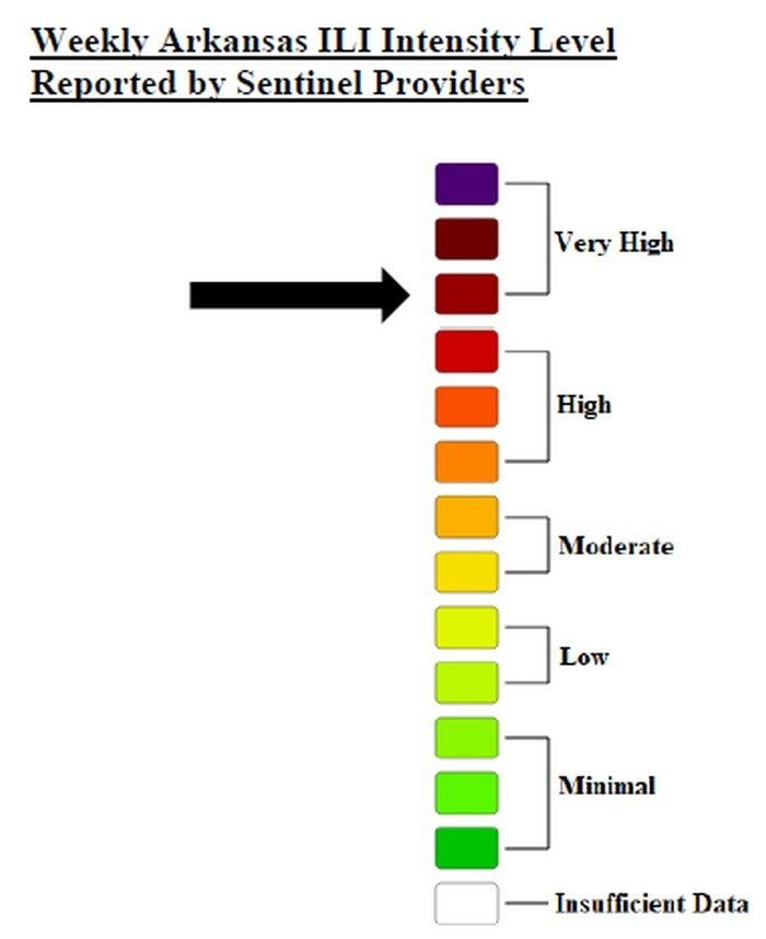 The latest report from the Arkansas Department of Health shows the flu level is very high in the state for the week ending Jan. 31. There are 13 levels on the chart and the latest report was at number 11. No average school absenteeism numbers were available due to school closures for weather.