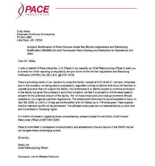 In a statement released by the city and the Harrison Regional Chamber of Commerce, leaders said they are aware of the potential closure involving Pace Industries and are working to gather additional details.