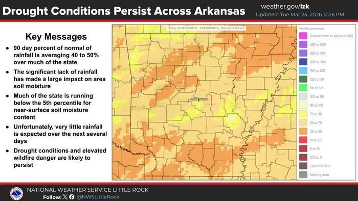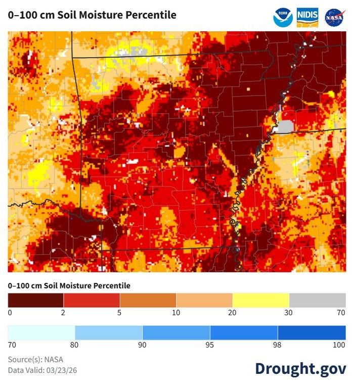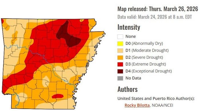 The latest U.S. Drought Monitor shows the dry conditions in the north central Arkansas are getting worse and the National Weather Service in Little Rock says there isn’t much relief in sight.