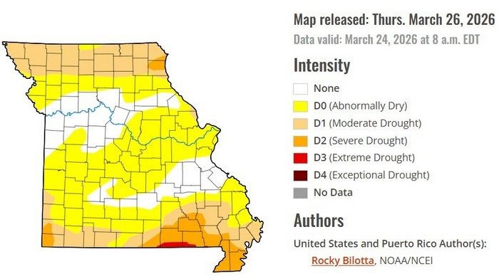 South central Missouri is not as bad with most of the area showing as moderate dry or abnormally dry, or three or two out of five on their scale.