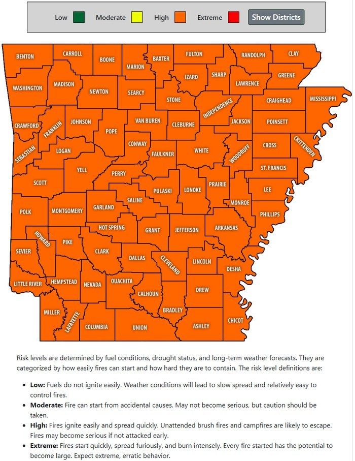 There continues to be a high wildfire danger across the entire state of Arkansas according to the Arkansas Department of Agriculture. Burn bans have been issued for all of the counties in north central Arkansas.