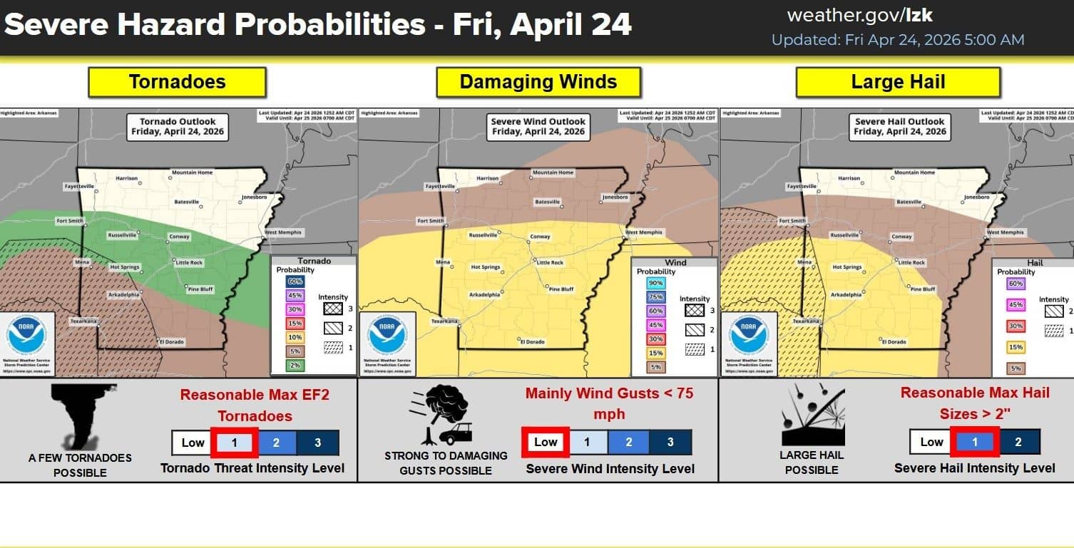 Friday’s expected chance for severe weather remains low at a reading of 1 out of 5 on the NWS scale of severe weather. Heavy rains will continue through the early part of the day with an inch of rain already observed at KTLO around 6 Friday morning. South of the Twin Lakes area into central Arkansas the severe weather increases where strong winds, large hail and a low chance of tornado activity is possible.