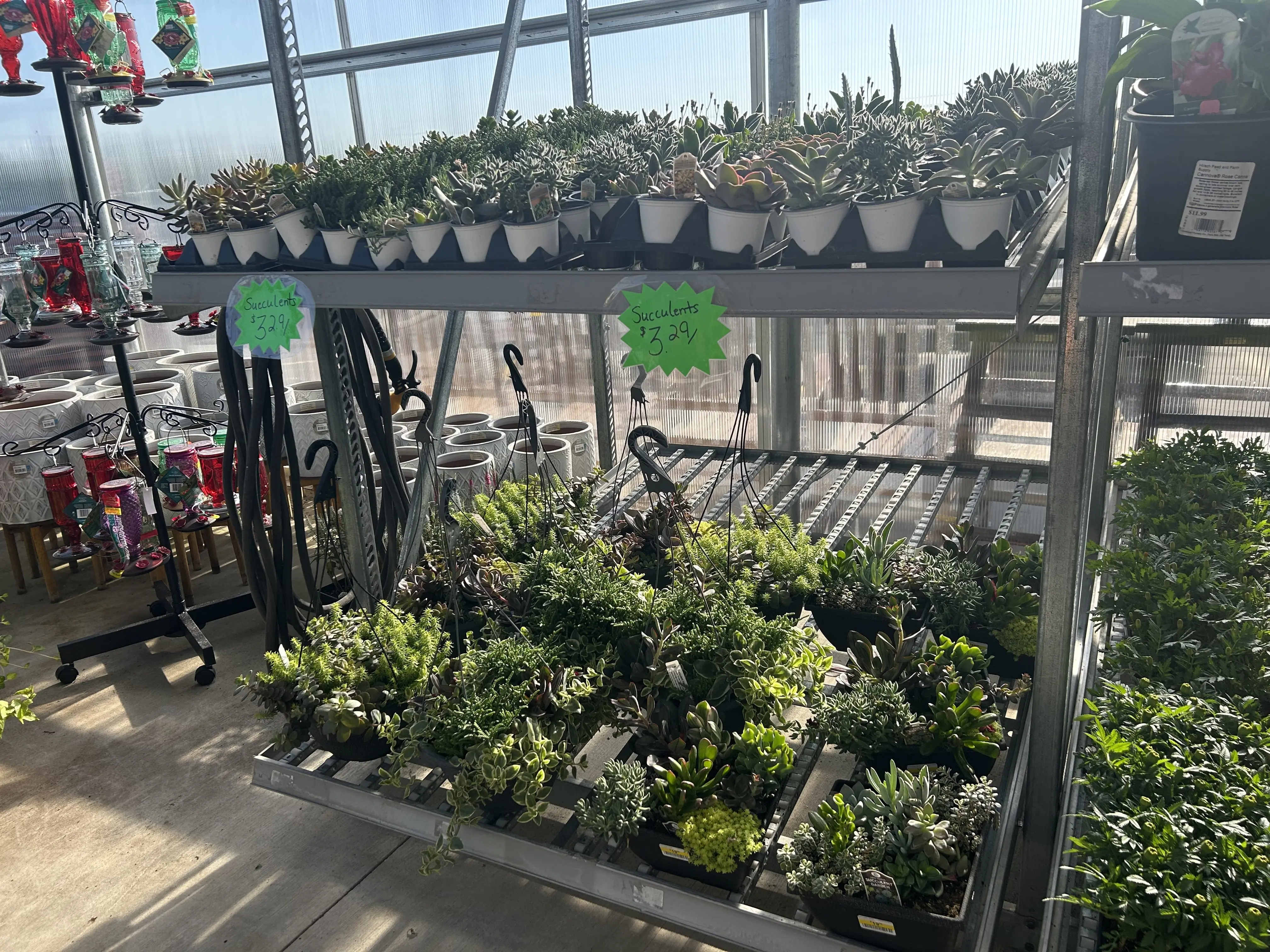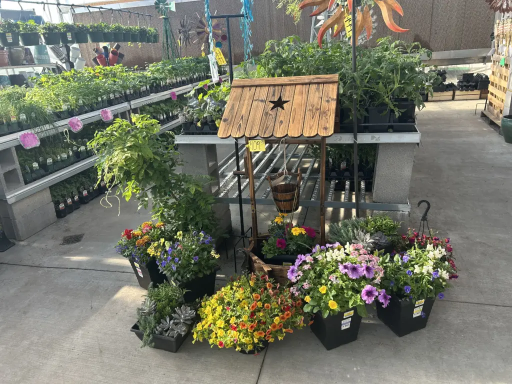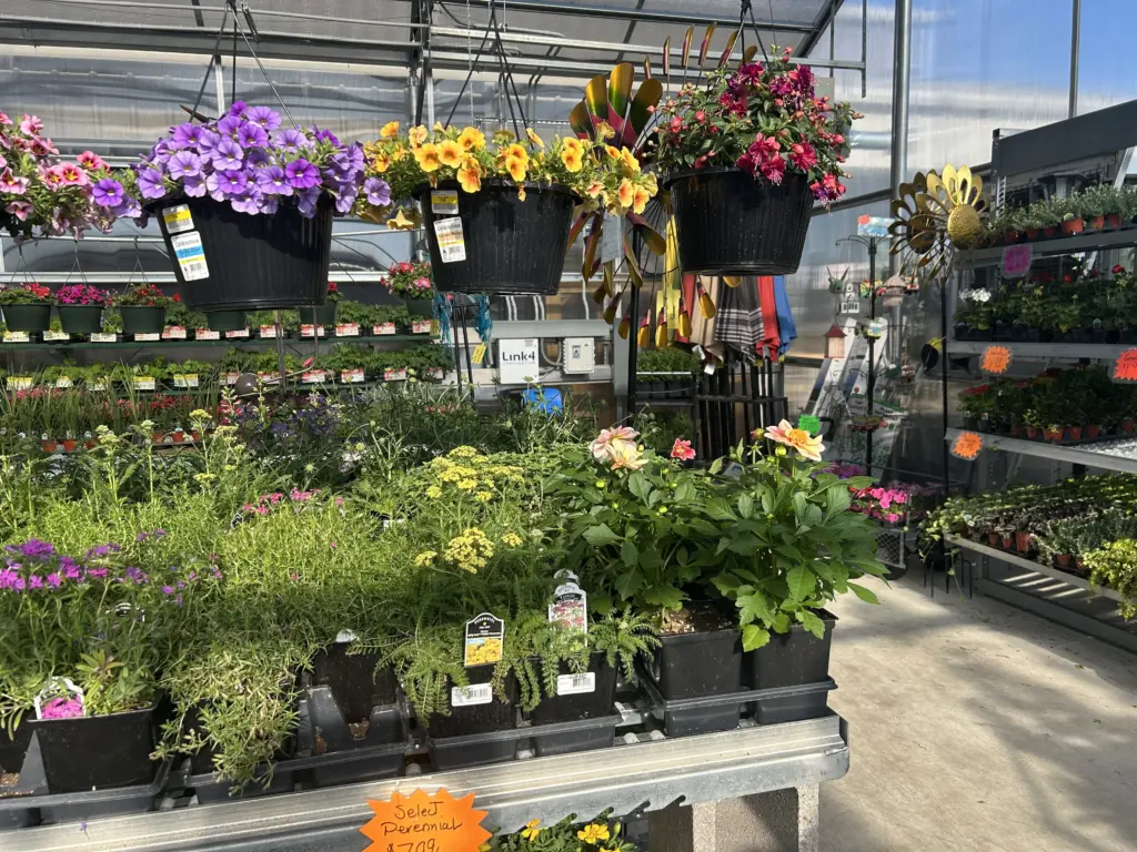Beautiful hanging baskets, bedding plants, and garden veggies.