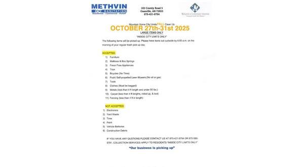 The annual fall clean up in Mountain Home is scheduled for next Monday through Friday. The clean up by Methvin Sanitation and Waste Connections is for customers in the Mountain Home city limits only.