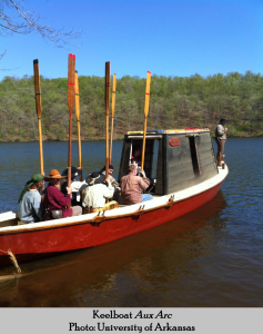 As the years passed, other types of boats began to work the White River. Flatboats were among the earliest. They were built broad, boxy vessels up to sixty feet long and twenty feet wide, with low sides about three feet high. Think of them as floating corrals: livestock crowded one end while a small hut or cabin stood on the other. Inside, a dirt pile served as a hearth for light, warmth, and cooking as the crew carried goods like whiskey, salt, furs, and pelts up and downriver. You can almost imagine the smell the mix of livestock, smoke, and river air drifting through the Ozark hills; think of Noah’s ark.