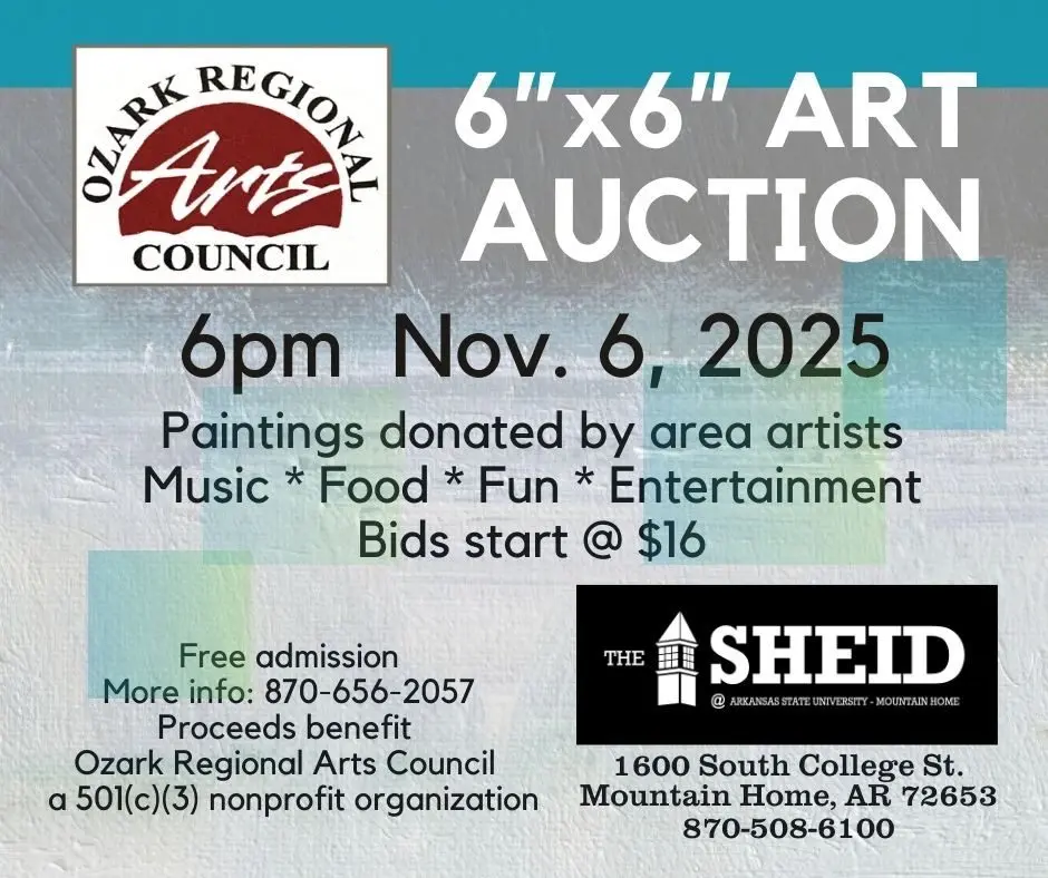 Join in the fun at The Sheid and bid in the silent auction of 6”x6” paintings donated by area artists. Music, food, fun, entertainment. Bids start at $16. Free admission. Sponsored by the non-profit Ozark Regional Arts Council.