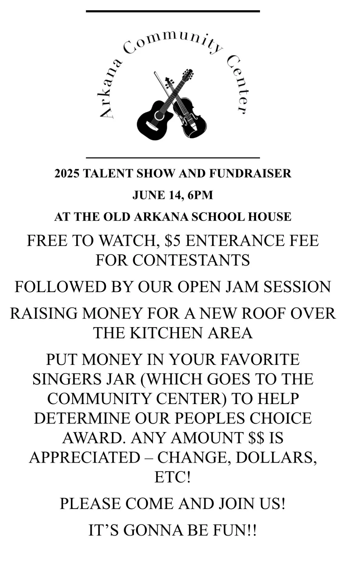 It is free to watch the contest! It only cost $5 to be a contestant. Each contestant will sing a song of a famous artist and dress like them. There will be a people’s choice award which is determined by the most money 💰 which is how the audience will vote on their favorite singer. All money goes to the community center to help replace the roof over the kitchen. Another winner will be the best of show which will be determined by a panel of judges. It all begins at 6 pm and will be followed by our regular jam session. Come join us! It’s gonna be fun! It’ll be at the Old Arkana Schoolhouse 10407 Hwy 201 S. Mountain Home AR