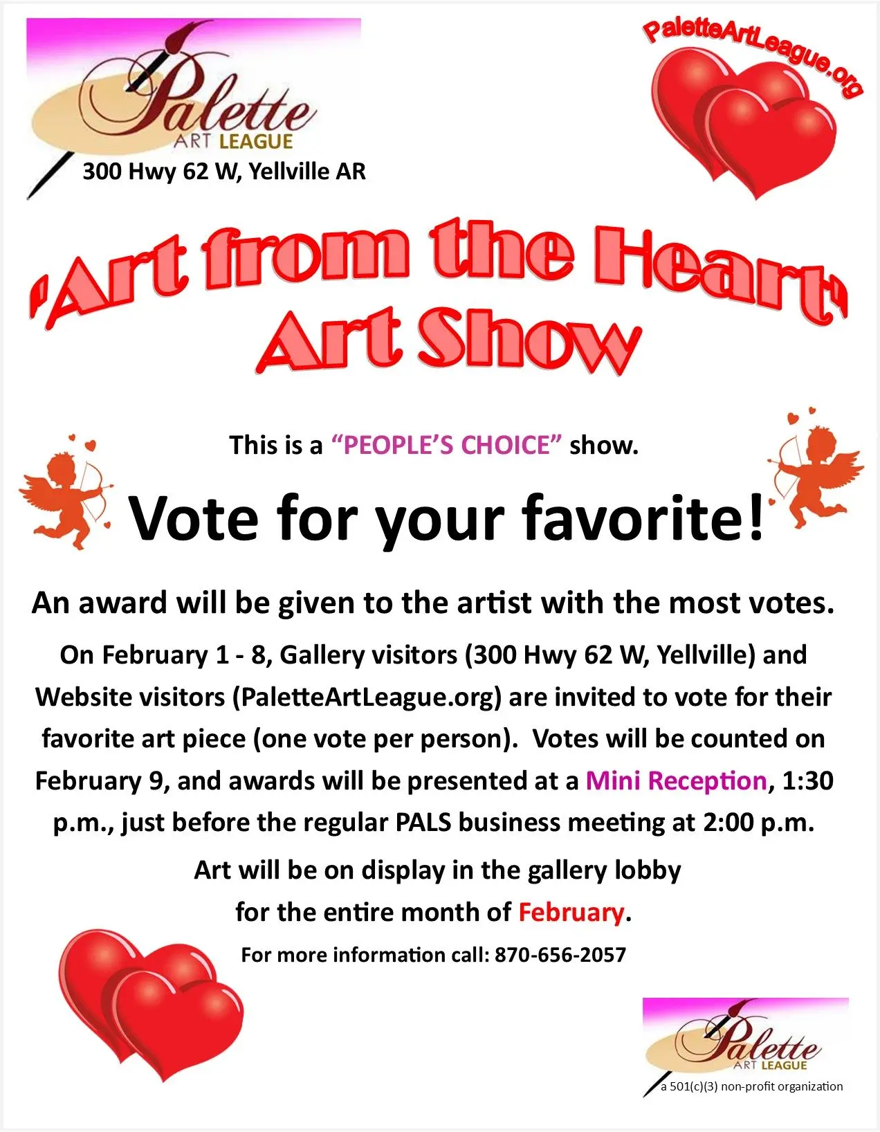 VOTE FOR YOUR FAVORITE! On February 1 – 8, PALS Art Gallery visitors (300 Hwy 62 W, Yellville) and Website visitors (PaletteArtlLeague.org) are invited to vote for their favorite art piece (one vote per person). Votes will be counted on February 9, and awards will be presented at a Mini Reception, 1:30 p.m. at the PALS Art Gallery. Art will be on display in the Gallery lobby for the entire month of February.