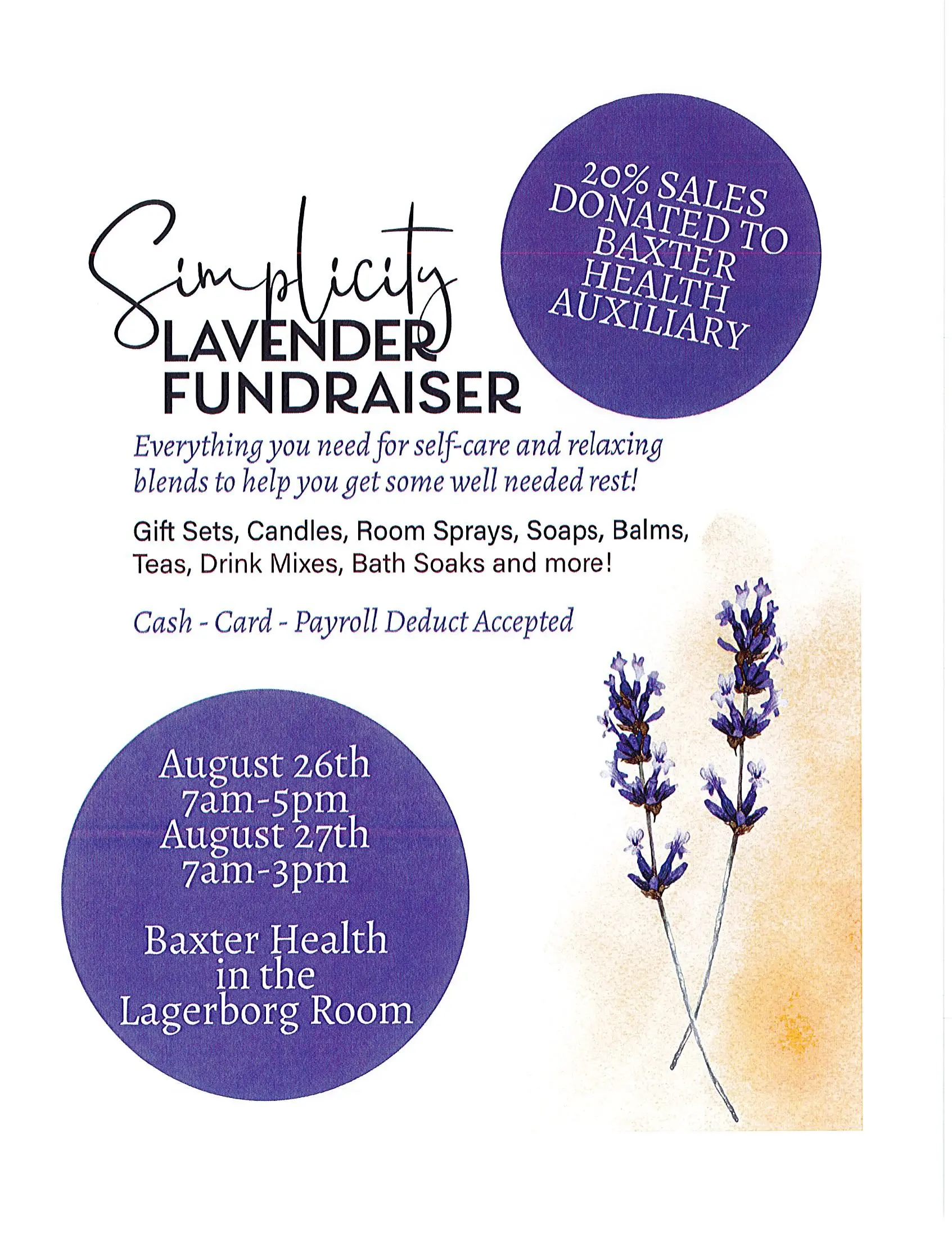Baxter Health Auxiliary will hold a 2-day fundraiser,00 Tuesday, August 26th, 7am-5pm and Wednesday August 27th, 7am-3pm in the Lagerborg Dining Room at Baxter Health. Simplicity Lavender will have everything you need for self-care and relaxing blends to help you get some well needed rest! Gift sets, candles, room sprays, soaps, balms teas, drink mixes, bath soaks and more will be available. Cash, Credit Card and Baxter Health Employee Payroll deduct accepted. All the proceeds raised go to support special services, projects and equipment needs at Baxter Health.