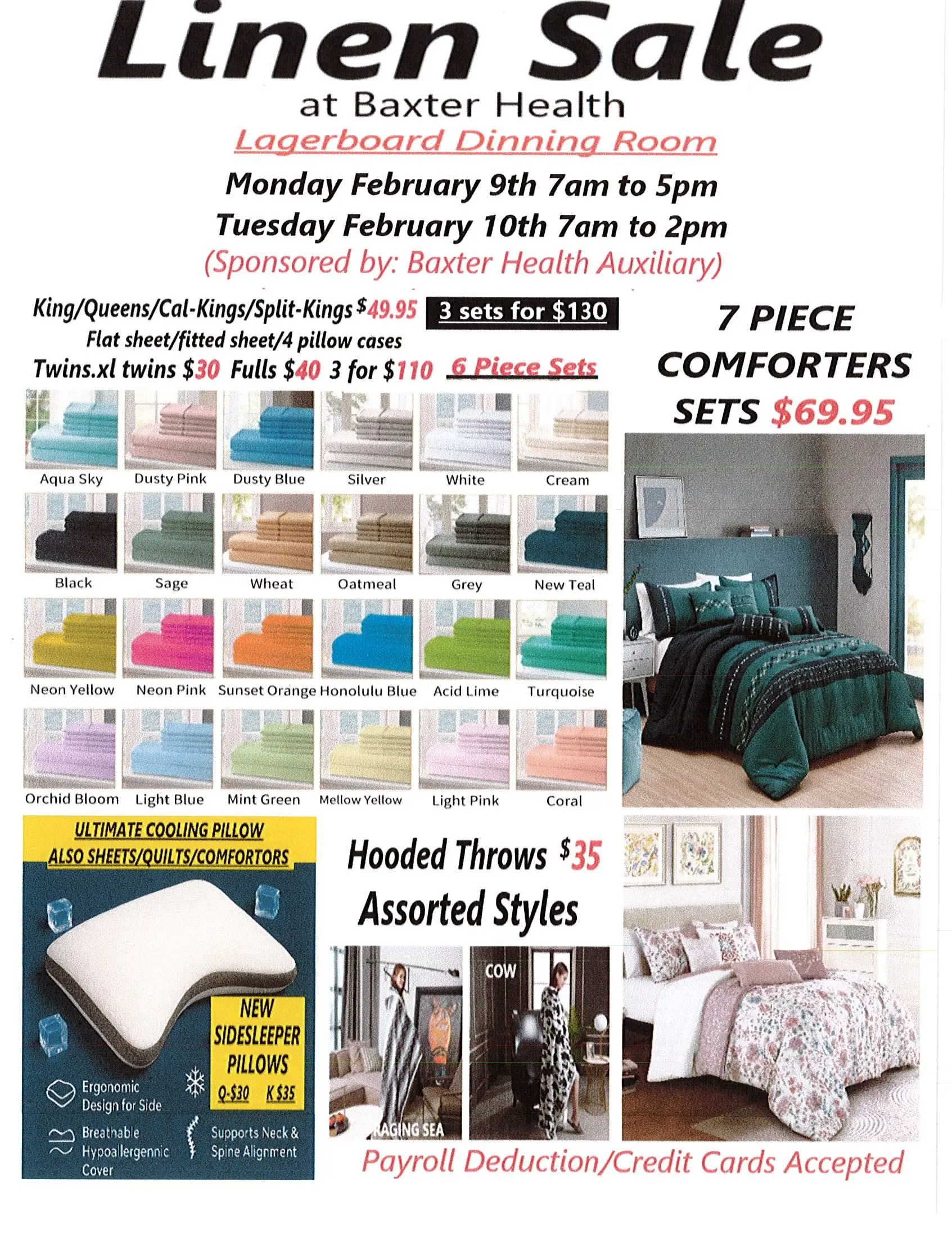 Baxter Health Auxiliary will hold a 2-day fundraising event. Monday, February 9th, 7am-5pm and Tuesday, February 10, 7am-2pm in the Lagerborg Dining room at Baxter Health Hospital. Blankets, throws, wearable throws, sheets in all sizes and pillows including the ultimate cooling pillow and the new sidesleeper pillow will be available for purchase. Credit/Debit card, cash and Baxter Health payroll deduct will be accepted. All monies raised goes to support special services and equipment needs at Baxter Health.