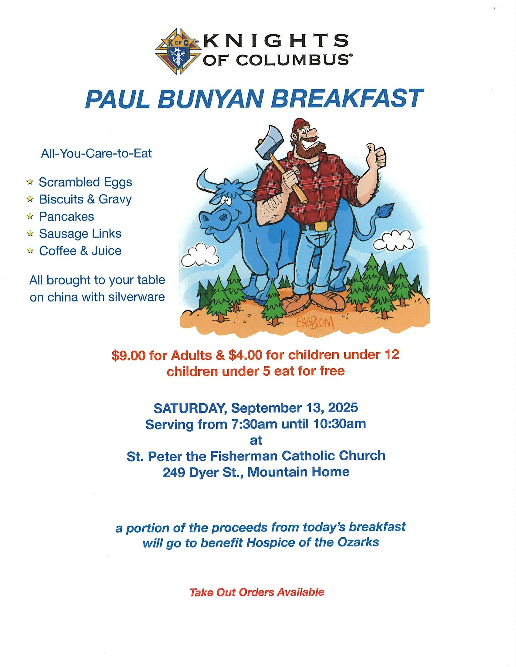 Enjoy an “All You Care to Eat” Paul Bunyan Breakfast with scrambled eggs; biscuits & sausage gravy; pancakes; sausage links; coffee & juice, served on china and brought to your table. All for the family friendly price of $9.00 for adults, $4.00 for children under 12, and free for everyone under 5. Breakfast is served from 7:30am to 10:30am in the Parish Life Center at St. Peter the Fisherman Catholic Church, 249 Dyer St., Mountain Home. A portion of the proceeds from this Paul Bunyan Breakfast will go to benefit the Hospice of the Ozarks. And the on duty officers of the Mountain Home Police Department will be our guests as the 1st responders for the month of September. Take out orders are available.