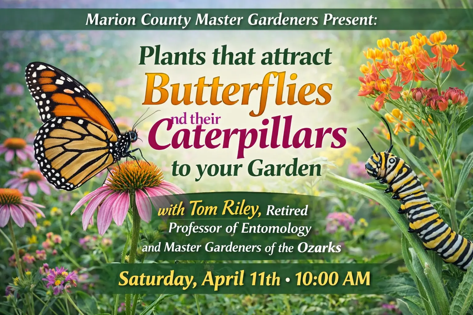 10am Educational Program – “Plants that attract Butterflies and their Caterpillars to your Garden” with Tom Riley, Retired Professor of Entomology, and Master Gardeners of the Ozarks.
