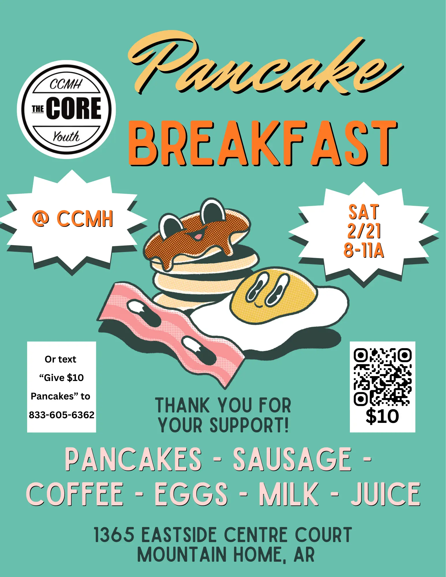 Pancake Breakfast to support Christian Church of Mountain Home Youth to fund camps/ trips. $10 at the door with unlimited pancakes.