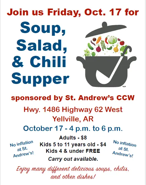 WHERE: St. Andrew’s Catholic Church, 1486 Hwy 62 W., Yellville