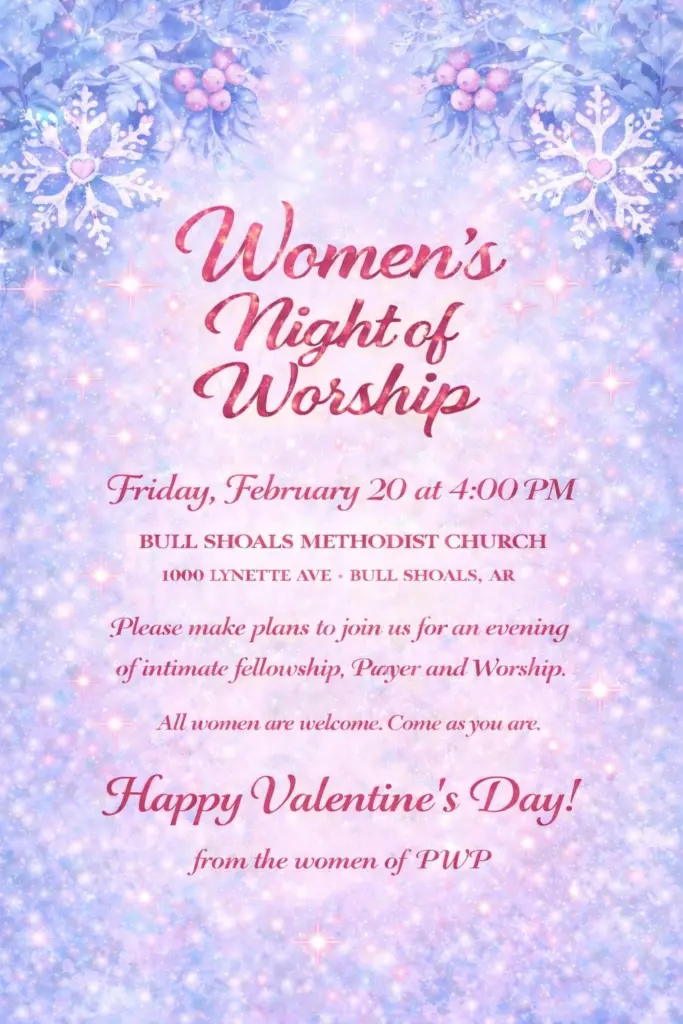 Bull Shoals Methodist Church, Women’s, Group, PWP, will host a women’s night of worship February 20 at 4 PM. Please make plans to join us for a cozy night of song and prayer, followed by fellowship in the sanctuary.