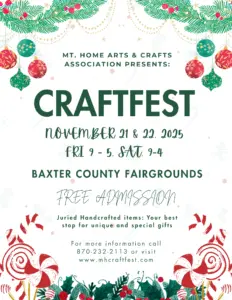 Craft Fest is a juried (for handcrafted items) two (2) day craft show. Sponsored by the Arts & Crafts Association of Mountain Home. theartsandcraftsgiftshop.org. Craft Fest is the longest running craft show in Mountain Home. Craft Fest began in 1963 on the square in Mountain Home, setting up on the courthouse lawn. We’ve changed location and now offer our vendors an indoor venue. The goal of the Arts & Crafts Association and Craft Fest is to give the home hobbyist/crafter…