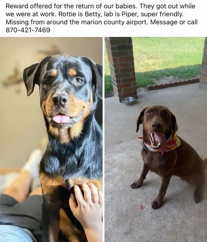 - On 10/27 my dogs escaped from my back yard. I don’t know what time, but I got home at 6:00 pm and started looking immediately. They have been gone since, with no sitings. They do not have their collars on. I live in Flippin behind the Marion County airport. One is a chocolate lab named Piper and the other is a Rottweiler named Betty. Can you put this on the radio for people who do not have Facebook? There is a reward offered for the safe return of both of my girls.