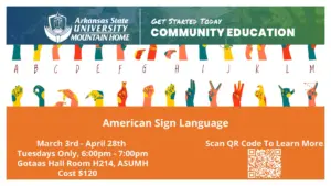 Are you interested in learning Sign Language? This course is designed for students who wish to expand their knowledge in conversing with people who are deaf. Includes receptive and expressive skill building, fingerspelling, Deaf Culture, conversational signs and time in ASL. Classifiers, locations, temporal aspect, videos with Deaf Signers, and guest speakers. *Class will not be held March 24th, due to Spring Break.
