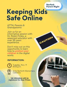Norfork School District will host an event for parents, grandparents, guardians and community members about helping keep kids safe online. Dr. Robin Finley will be presenting information on the dangers kids face and how we can protect them.