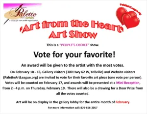Vote for your Favorite at www.PaletteArtLeague.com “Art from the Heart” Art Show” reception & awards ceremony is Thursday, February 19, 2 – 4 pm. A Door Prize will be drawn from all votes counted. Hope to see you there!