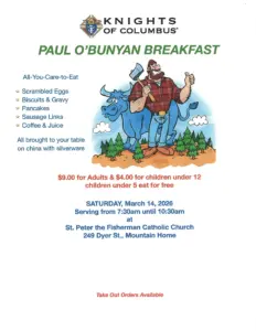 Get a head start on your St. Patrick’s Day celebration by enjoying an “All You Care to Eat” Paul O’BunyanBreakfast menu of scrambled eggs; biscuits & sausage gravy; pancakes;link sausage; coffee & juice; served on china and brought to your table. All for the family friendly price of $9.00 for adults; $4.00 for children under 12; and free for everyone under 5. Join us on Saturday, March 14th, between 7:30am and 10:30am in the Parish Life Center of St. Peter…